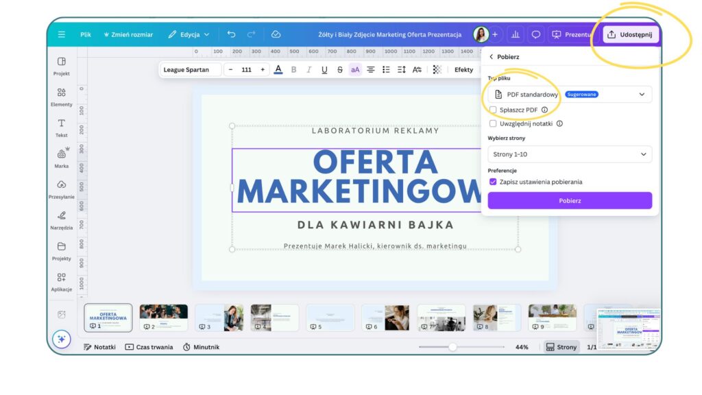 Na koniec kliknij „Pobierz” i wybierz format PDF (jeśli nie zamierzasz drukować oferty wybierz PDF standardowy; jeżeli zamierzasz drukować ofertę – wybierz PDF do druku, zaznacz spady i ustaw kolory w palecie CMYK).