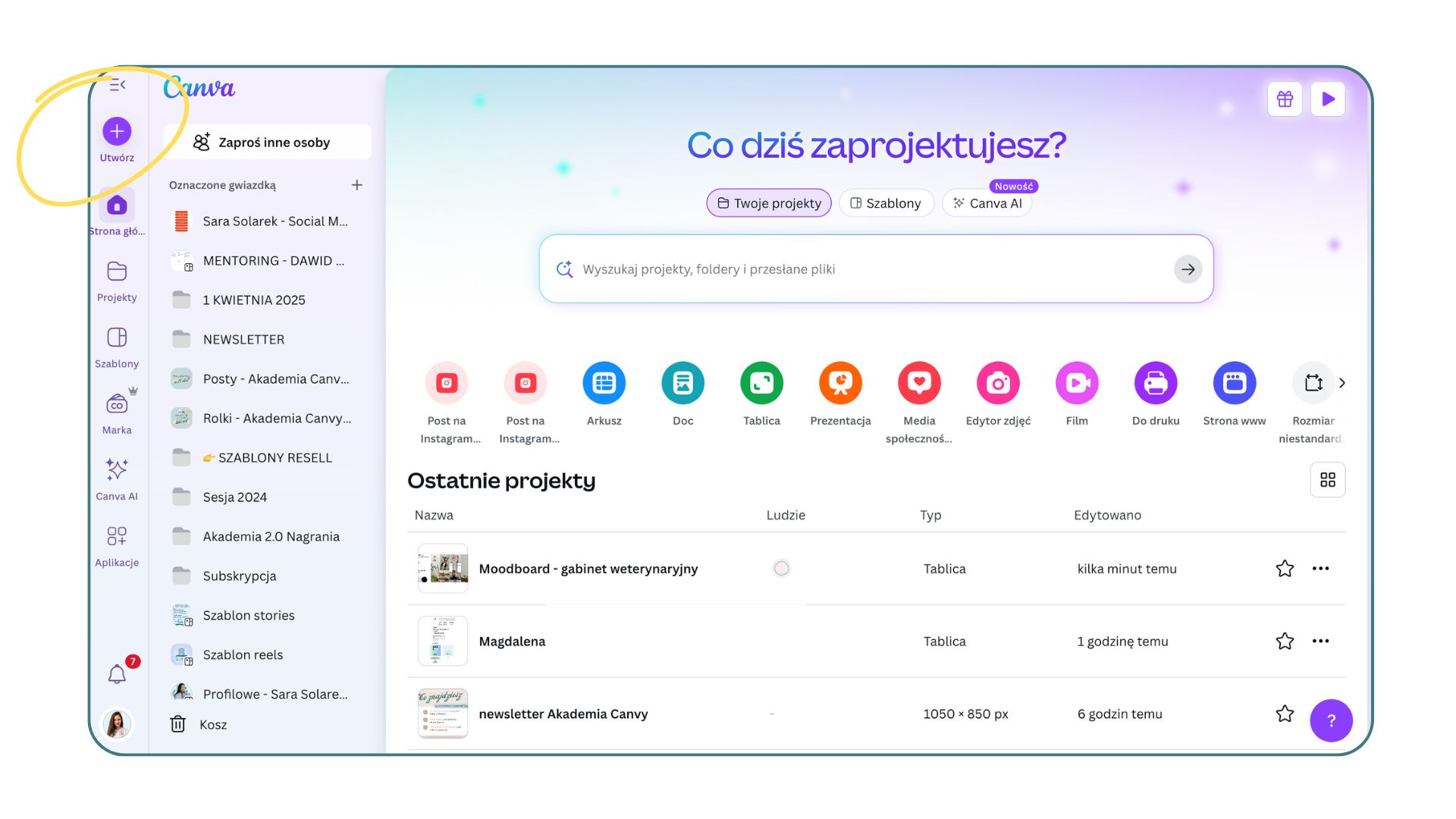 Wejdź na www.canva.com i wybierz odpowiedni format dokumentu (np. A4, prezentacja).